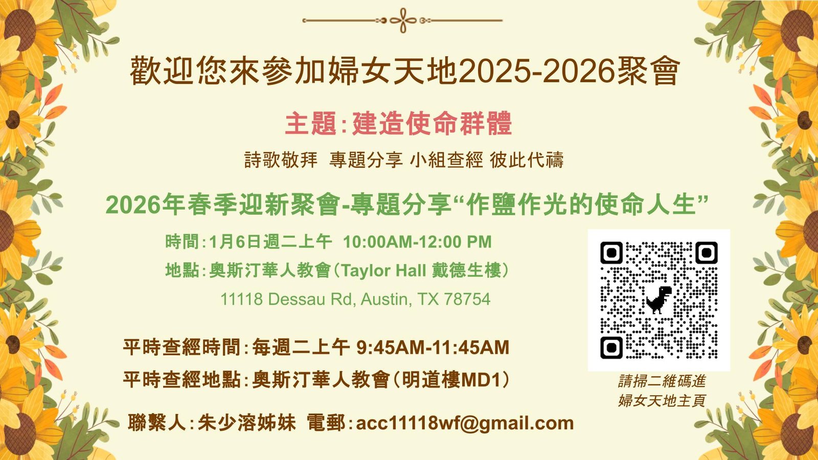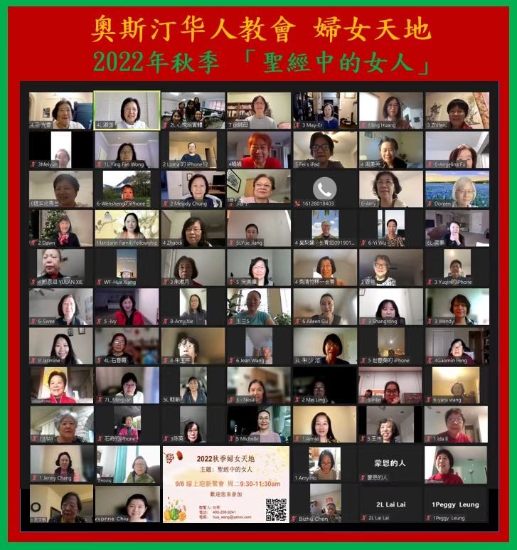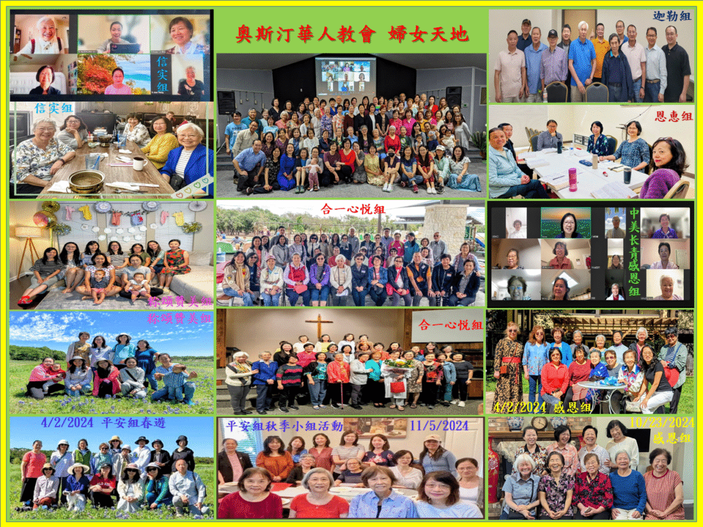 简介: 奥斯汀华人教会的婦女天地是一个跨語言,跨团契,跨年龄以及跨教会的团契。在这里您可以相遇经历丰富的伯母,稳重热情的阿姨/姊妹,精力旺盛多才多艺的年轻妈妈,和各种背景充满爱心的姊妹们。我们希望能藉着每周二的聚会,让您的每一天都充满喜乐和平安。在这个大家庭里我们一同享受从神那儿来的恩典和慈爱,并将这爱传递给周围的每一个人。欢迎您加入这个喜乐的大家庭!